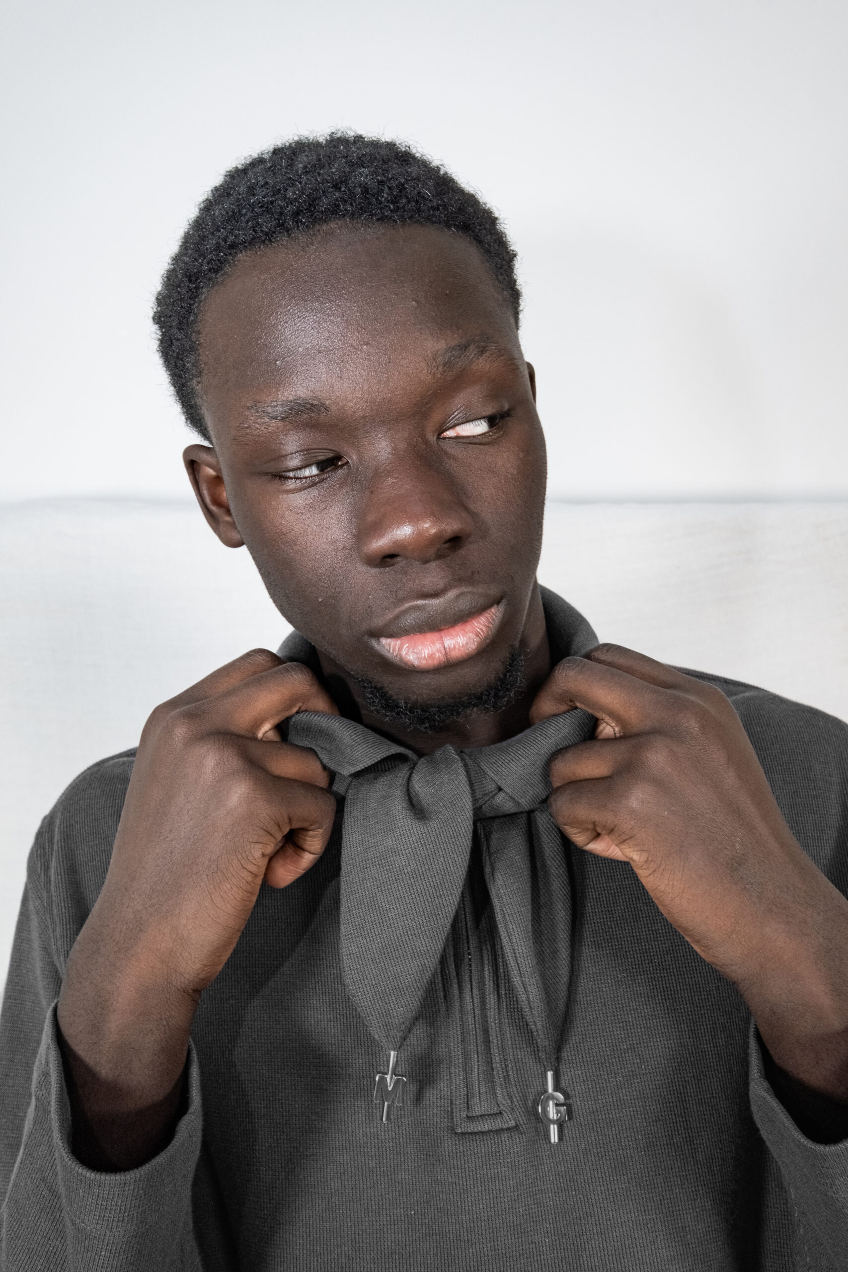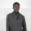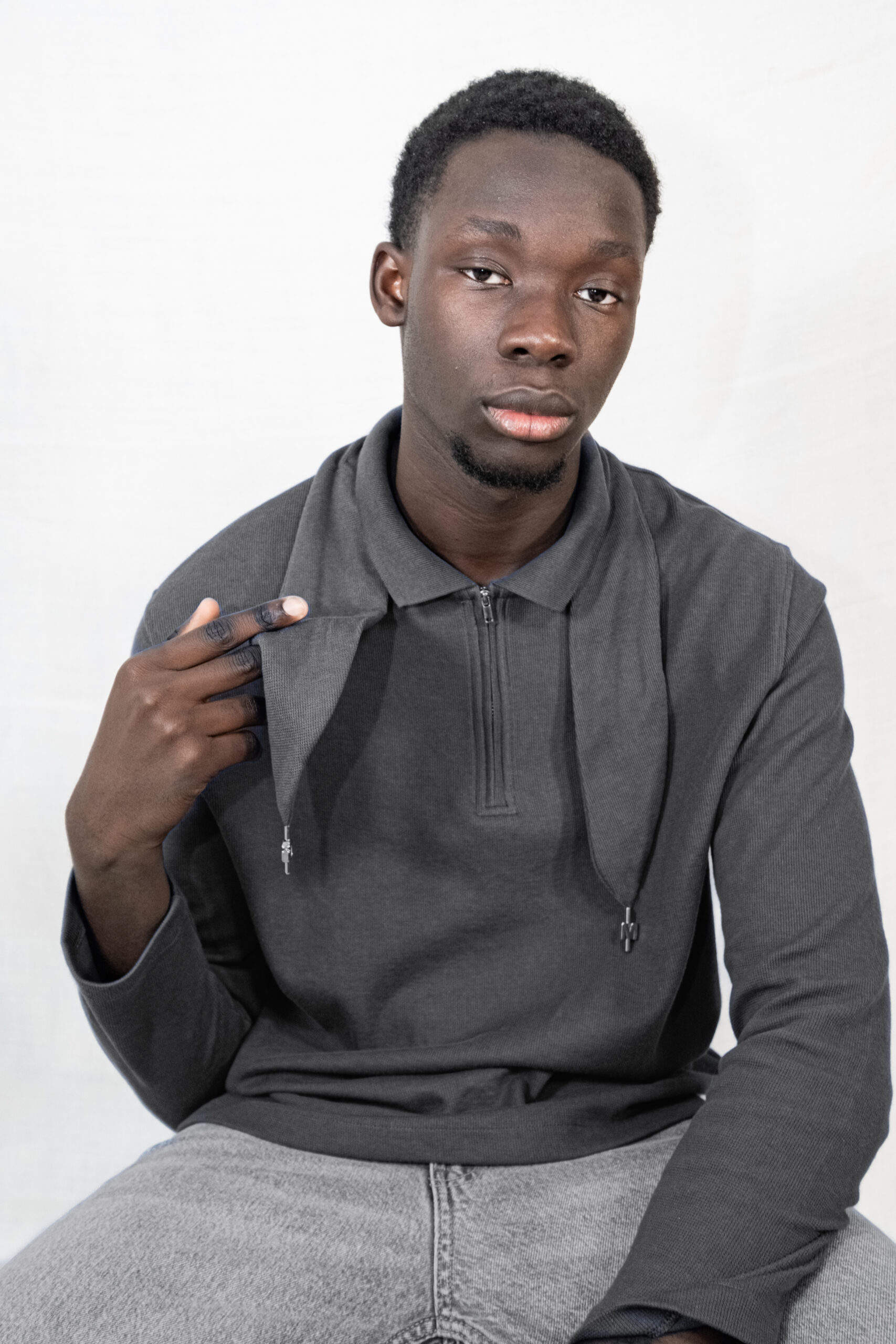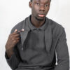 Polo à manches longues gris foncé. Col noué et demi-zippé.